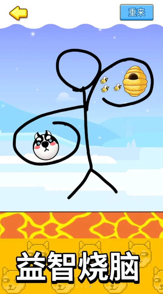 玩家在关卡中能够看到蜜蜂和狗头,玩家的任务就是绘画出线条保护狗头,在绘画完成后蜜蜂就会从蜂巢中出来攻击狗头,线条的保护不够狗头就会被蜜蜂攻击哦,快点下载游戏吧!