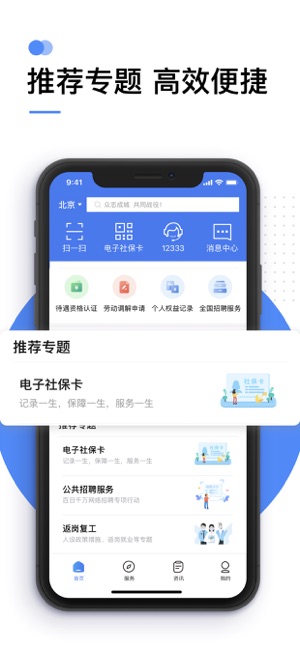 “掌上12333”分为“首页”、“服务”、“资讯”、“我的”四大服务栏目,支持电子社保卡的集成服务,主要提供养老保险待遇资格认证、求职招聘、社保卡查询、职业资格证书核验、社会保险关系转移等人社线上服务。