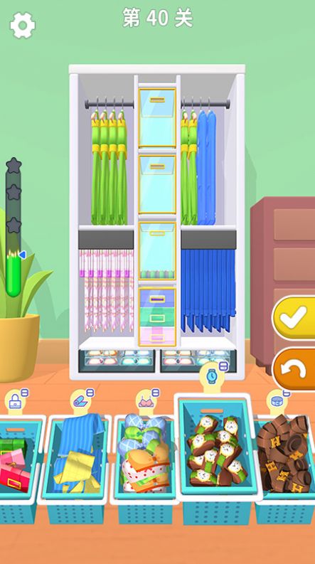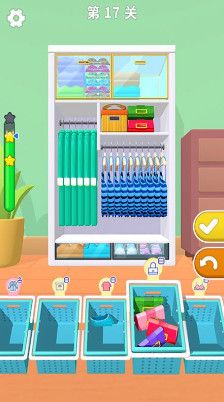 4、游戏移动这些筐子就能选择放置的物品,放到柜子的不同空间完成收纳的任务。
