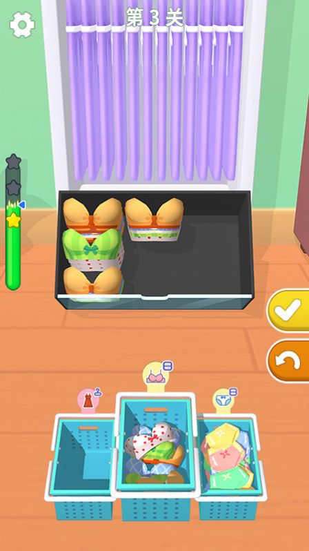 1、游戏玩家仿佛真实的在关卡中进行收纳任务,将物品放进形状不同的柜子中。