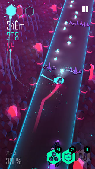 界面简洁,画质高清,很有科技感,音效和特效也是,未来感真的酷炫到没朋友,每个关卡的歌曲真的是电音爱好者的福利。