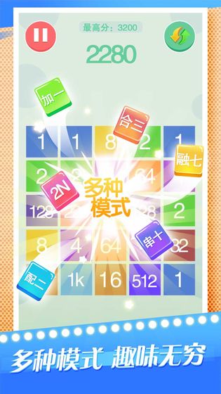 1、游戏提供了六种模式:加一、配二,合三,融七,串十和2N,每种模式具有一种独特的玩法。