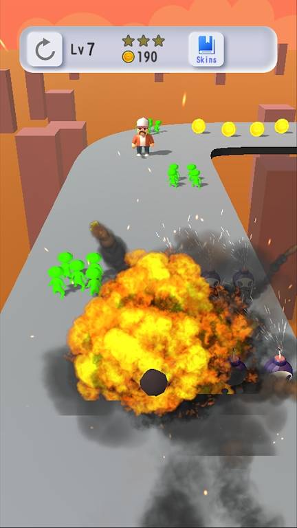 玩家控制小人在关卡的道路上收集小人,还要躲避危险的会突然爆炸的炸弹,保护自己收集的小人安全的来到游戏的终点,打败强大的BOSS才能完成关卡的任务进入下一关挑战,快点下载游戏吧!