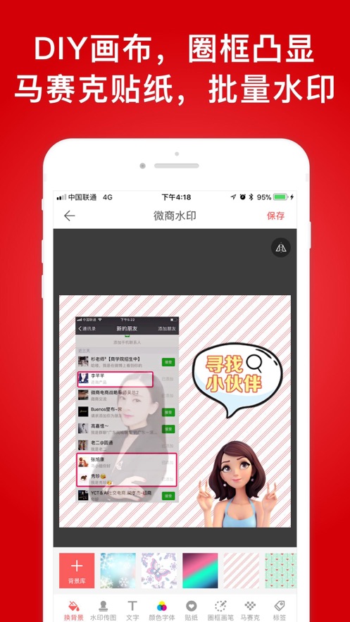 3、可以做截图,微信对话、微信红包、微信转账、微信零钱。4、上传自定义水印图标,上传图标作为水印;