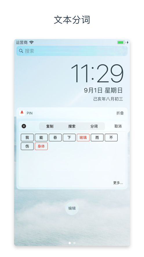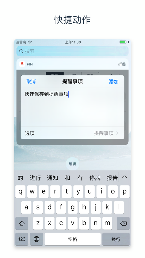 Pin 的剪贴板可以对某个数据进行 “PIN” 操作,意思是把数据置顶,这样的话方便一些更重要的数据可以随时看到。在通知中心长按可以进行PIN、删除操作。在主应用可以主动添加一个数据,而不需要从剪贴板粘贴。 Pin 的剪贴板会对数据进行合理的处理,比如说点击链接的时候会自动在全部文本中把链接拿出来,电话号码也一样。