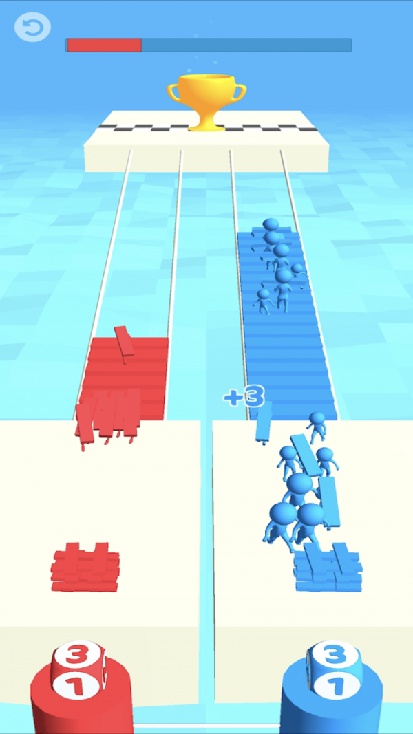 玩家在游戏中帮助小人完成造桥的任务,想要比对手快玩家需要增加小人的数量,这样小人越多拿板子的数量也多造桥的进度就会加快,让玩家能够来到终点赢得比赛的胜利,快点下载游戏吧!