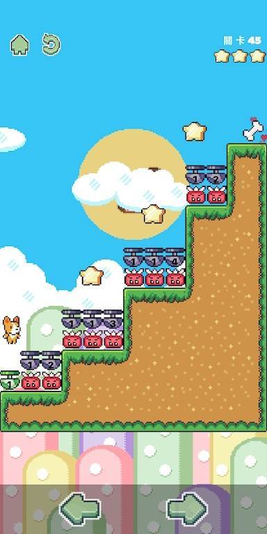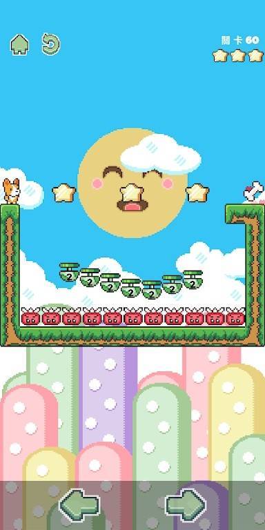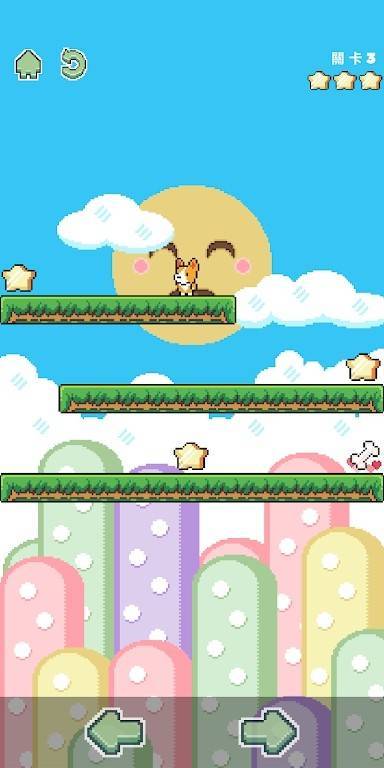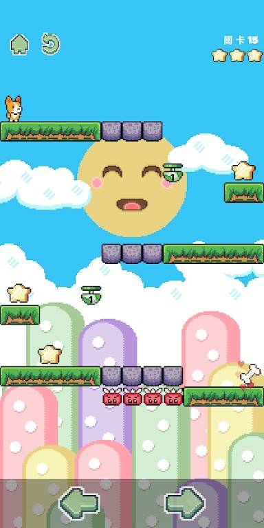 2、游戏每一关的地图都是不同的,玩家控制小狗来到地图中不断的跳跃完成关卡挑战