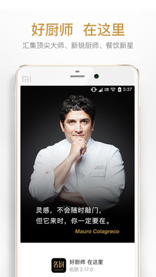 名厨是一款专注餐饮的专业媒体APP,业内优秀厨师的汇集地。创意菜品,特色餐厅,新奇食材,优秀厨师都可以在名厨找到。我们面向厨师,立足行业,着眼创新,致力于为千万厨师提供一个有层次,有品位,有号召力的平台!