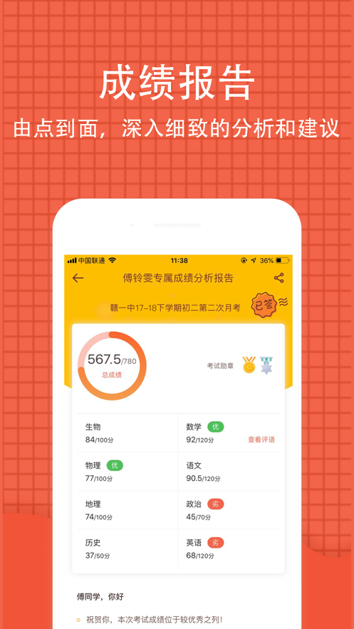 好分数家长版是为使用好分数app的学生家长查分并指导孩子学习的移动应用,家长可以查看孩子的分数和排名,通过好分数提供的分析报告全面了解孩子的学习状况,包括多维度成绩分析、优劣势科目、薄弱知识点等等,同时通过应用自动建立的错题本指导孩子学习,参与到孩子的学习过程中,帮助孩子好好学习,提高成绩。