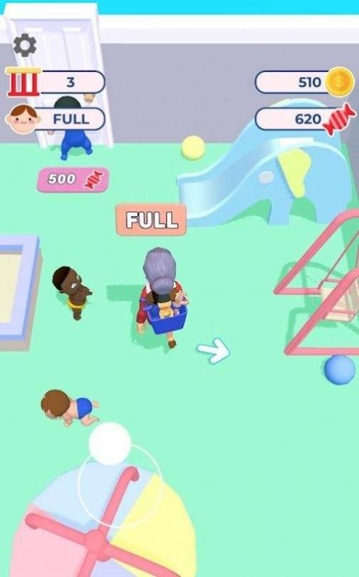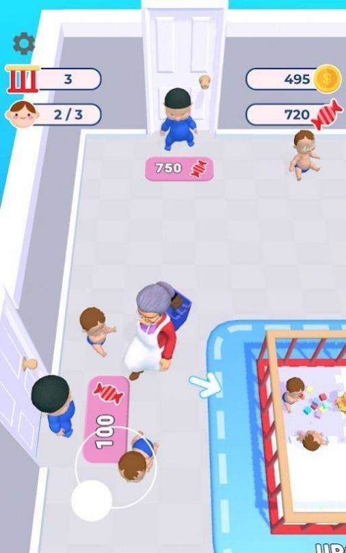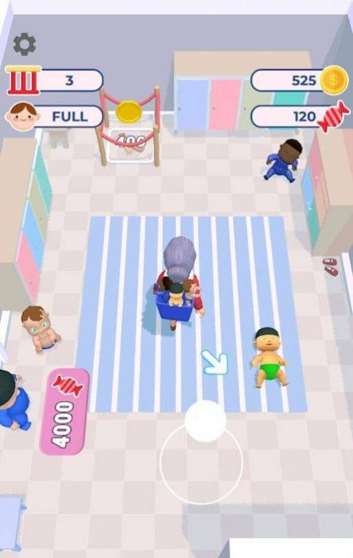 玩家在场景中移动保姆收集婴儿,将这些婴儿放在指定的地方就能获得很多的金币,金币是可以兑换糖果来扩大面积,在更多的地方收集婴儿完成超多的挑战,快点下载游戏吧!