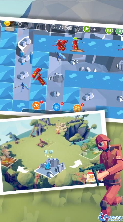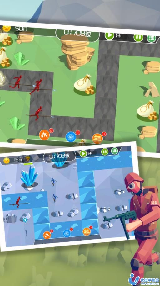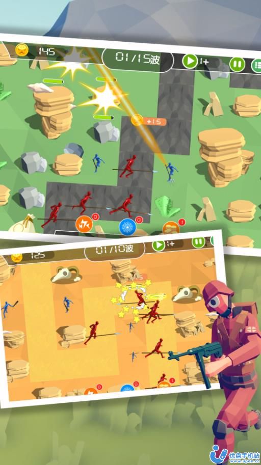 1、游戏玩家在关卡中可以自由的购买小人,这些小人站在不同的位置攻击敌人。