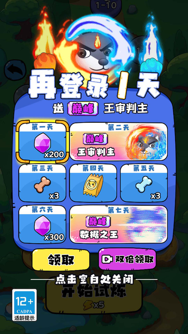 2、可以通过挑战不同的关卡来获取游戏币和宝箱奖励,用于提升狗狗们的能力和解锁新的角色,为战斗做好准备。
