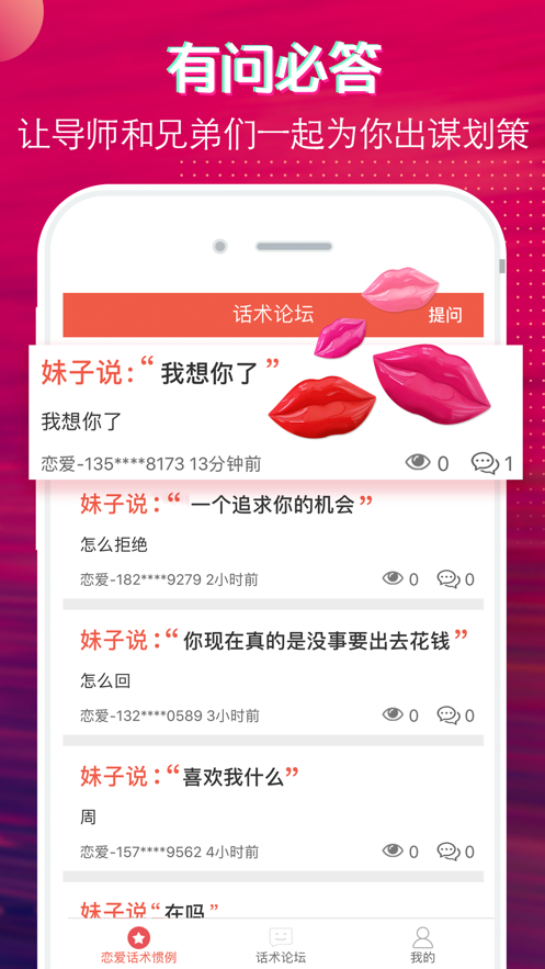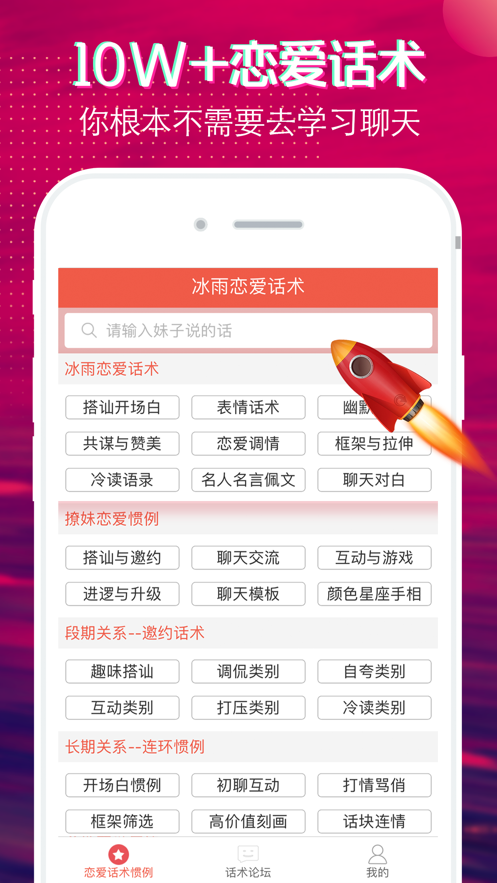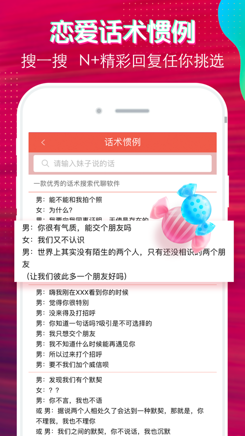 恋爱教程,拥有成千上万的可搜索恋爱话术,套路惯例与聊天模板。