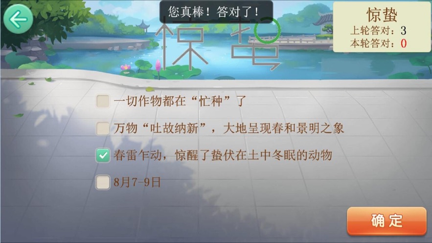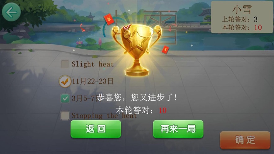 3、游戏的题目非常多,有关24节气的知识都汇集在其中,玩家随时开始游戏的挑战。