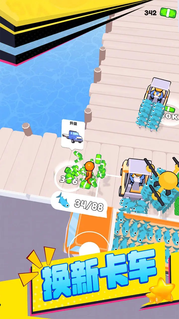 2、游戏只要将鱼放到车上就能获得资金,这些资金会帮助自己发展经营港口。