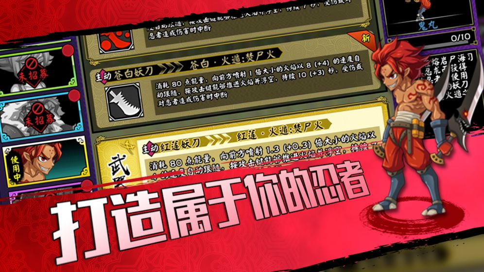 每个忍者各有自己独一无二的设计,或擅长击杀,或擅长隐身,或擅长生存,技能之间相辅相依,属性成长差异明显。