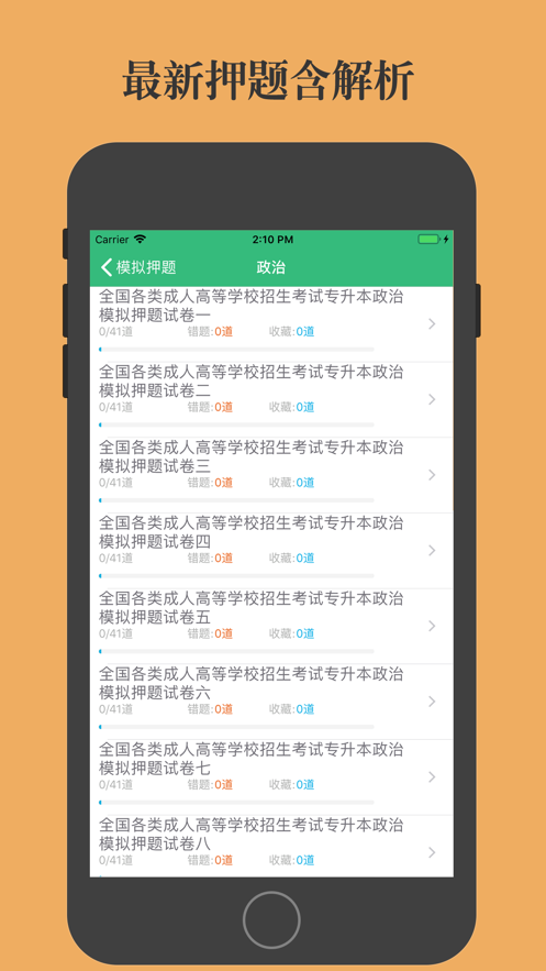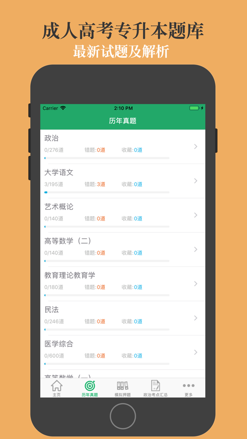 有模拟考场、历年真题练习、每日一练、快速练习、考点练习、考试押题、做题记录等多种学习与做题模式、丰富多样化的陪你一起考成人高考。