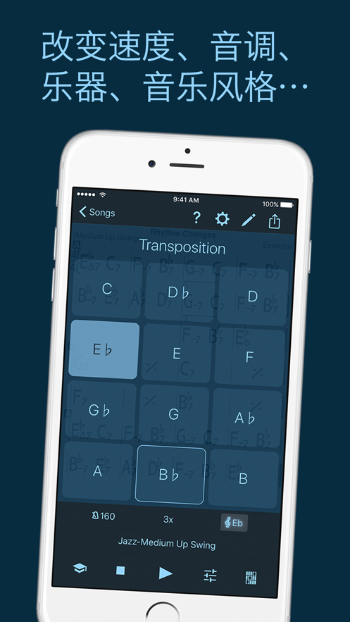 从应用中47种不同风格的伴奏中选择 (摇摆, 民谣, 吉普赛爵士, 兰草, 乡村, 摇滚, 时髦音乐, 雷鬼, 波萨诺沃, 拉丁) 以及12种蓝调风格作为一次性的应用内购买。