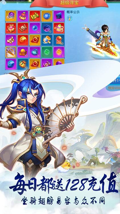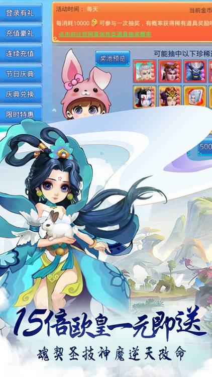 连续登陆:活动期间,每日登陆都赠送价值超过100元的道具以及金币奖励,第七天和第十五天直接赠送圣兽一只。