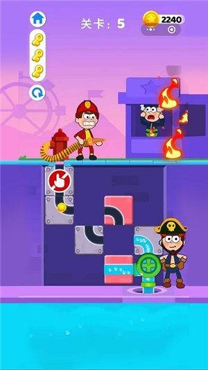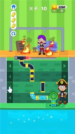 2、游戏的关卡中有很多的火场在等待挑战,移动这些管道使用水完成灭火的任务