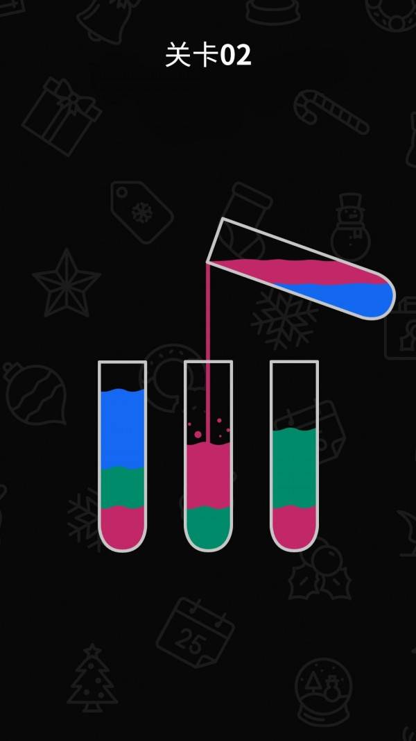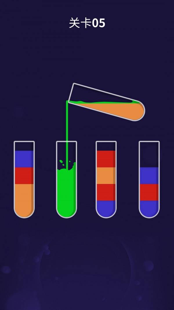 3、游戏为玩家模拟了逼真的倒水动作,将试管中的水移动不同的试管中完成分类