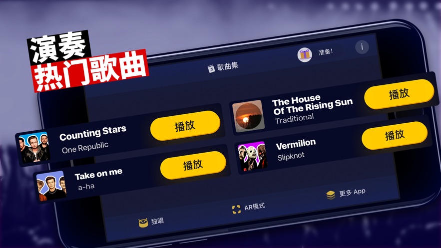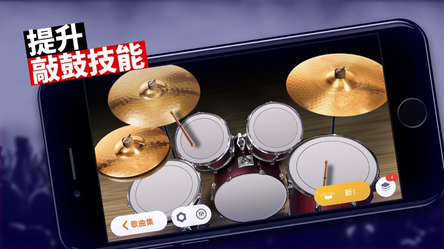 选择音乐:从种类丰富、体裁多样的乐曲中选择您喜爱的曲调在您的架子鼓上演奏。我们会定期在歌曲集中添加新的免费歌曲。