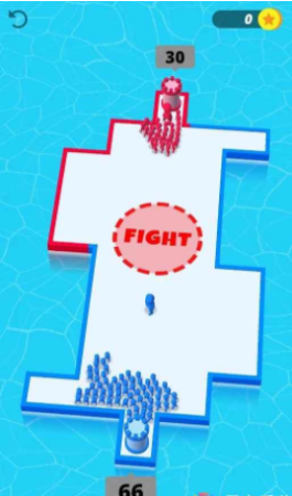 游戏关卡中小人的数量是有限的,玩家需要加快自己合并的速度收集平台上更多的小人,扩大平台的面积点击中间的按钮开始战斗,小人数量多的玩家能够赢得游戏胜利,快点下载游戏吧!