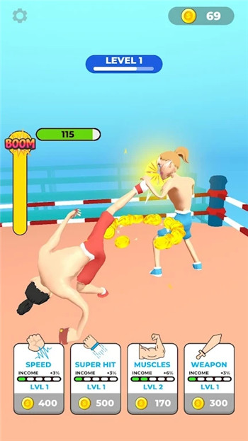 空闲格斗拳击游戏拥有细腻的3D卡通画面、丰富多彩的场景设计,通过虚拟摇杆和按键组合操控角色移动、防御和攻击,释放连招与必杀技,战斗中的打击感十足,让玩家身临其境地感受真实拳击的乐趣,每一次出拳都能带来震撼的快感。