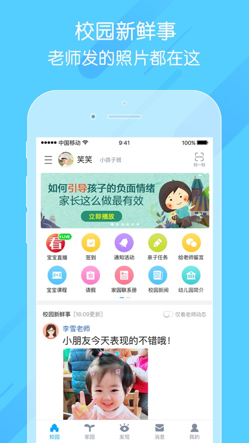 掌通家园致力于为幼儿园打造一个全新的家园共育互动平台。