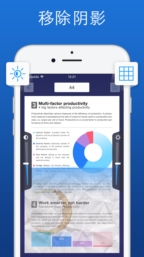 所扫即为所见,扫描后的图片、彩章、签名,看起来几乎跟纸质原版几乎一样。Scanner Pro能自动实时检测所扫介质边缘,并通过智能调整、纠正,保证扫描品质无可挑剔。您也可以通过点击屏幕来手动调节裁剪范围。
