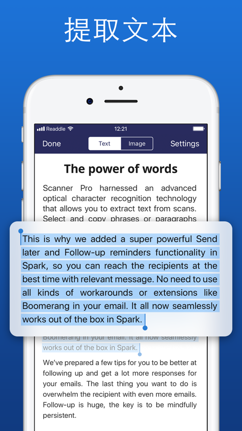 将扫描文件转换成可选择、可复制的文本。Scanner Pro现总共支持21种语言:简体中文,正体中文,捷克语,丹麦语,希腊语,克罗地亚语,爱沙尼亚语,乌克兰语,英语,德语,意大利语,法语,西班牙语,俄语,葡萄牙语,荷兰语,土耳其语,波兰语,瑞典语,挪威语以及日语。