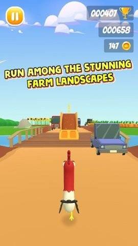 玩家控制公鸡在关卡的道路上不停的移动完成挑战,在公鸡的身后厨师一直想要杀掉公鸡,公鸡为了不被做成食物就在道路上开始逃亡之路,会有超多的障碍在前方阻碍玩家前进,快点下载游戏吧!