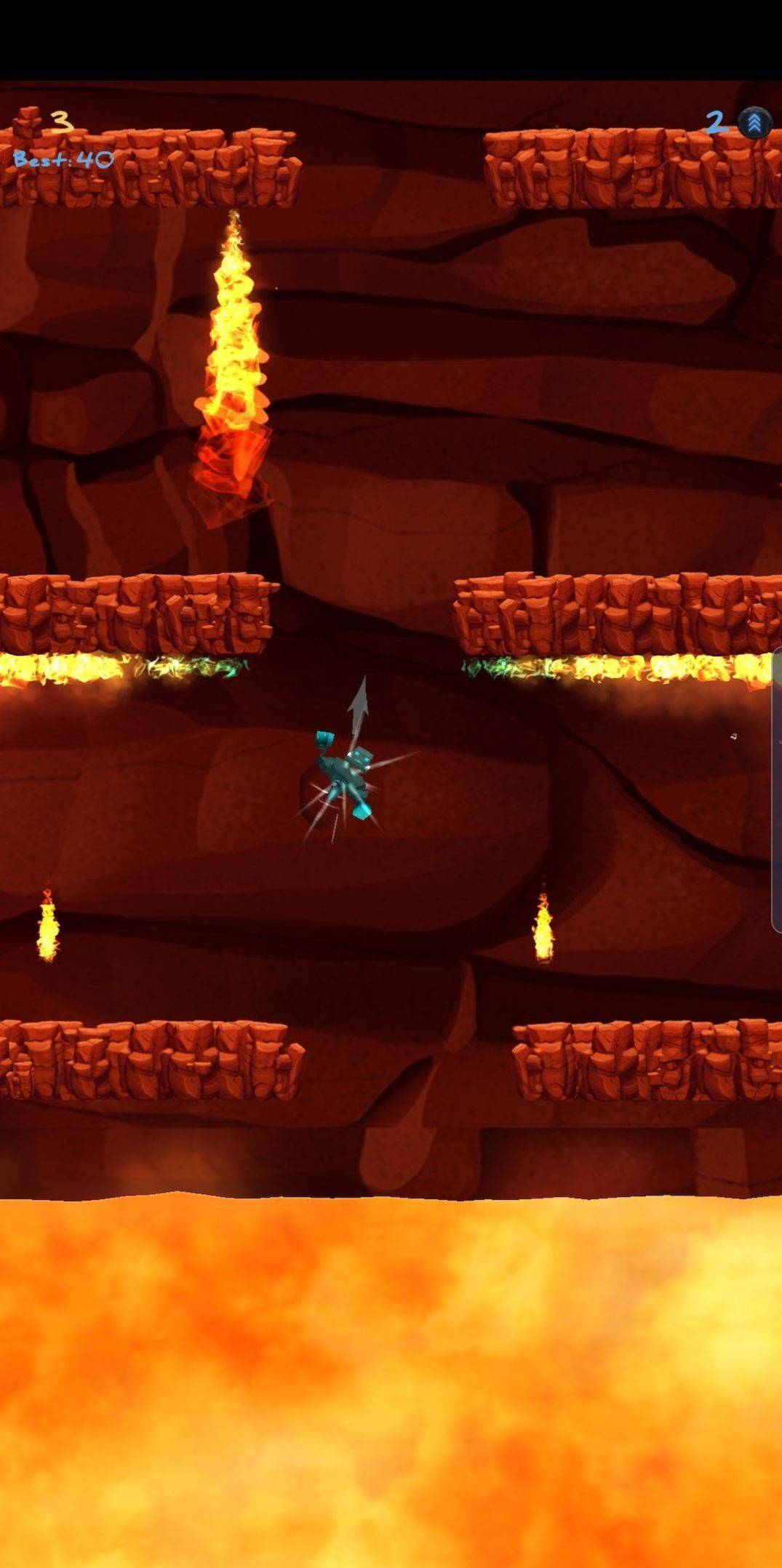 4、游戏关卡是能够重复挑战的,当掉下岩浆或者被碰到了障碍闯关就需要重现开始