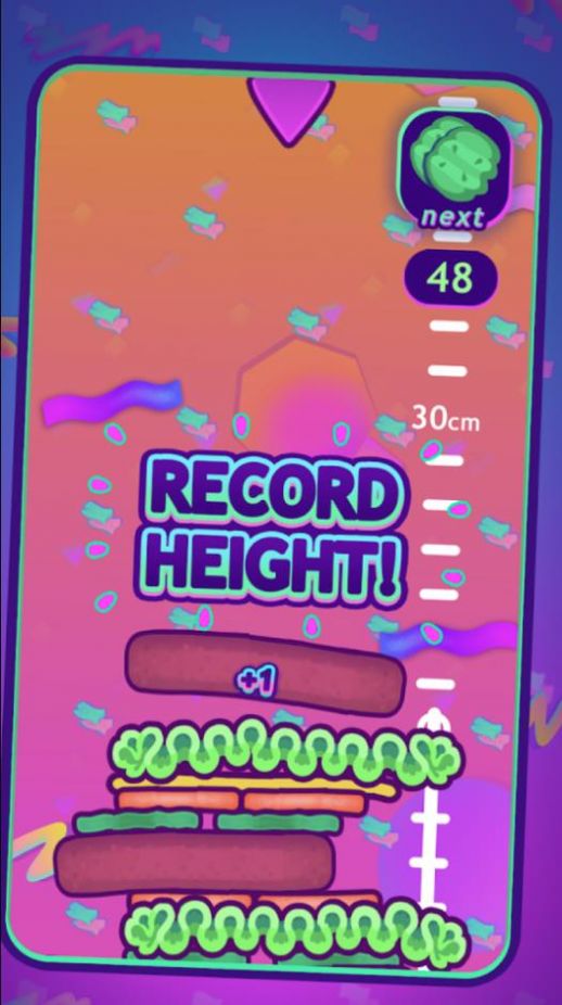 能够在关卡中堆叠这些出现的食材完成很多挑战,但是食材不同堆叠的难度就不同,需要保持平衡才能让汉堡可以持续的堆叠,不断的堆叠能够得到自己的挑战记录,需要不断的挑战刷新记录,快点下载下载游戏吧!