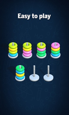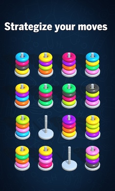 在关卡中会有很多的柱子,这些颜色圆环借助柱子的力量在关卡进行挑战,手指点击这些圆环来到合适的圆柱上,注意只有颜色相同且空间还有才能被成功的移动完成分类任务,快点下载游戏吧!