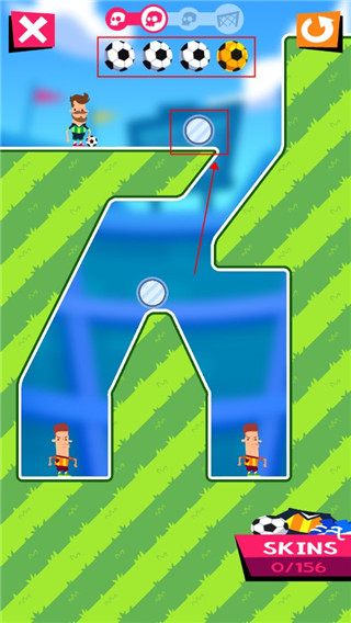 1、使用不同的足球皮肤进行射击挑战,通过反弹等方式完成各种游戏关卡的目标。