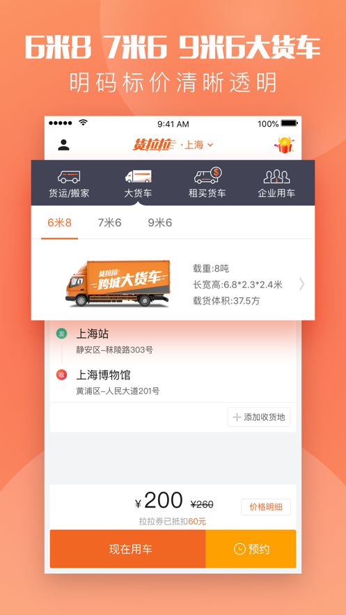 6、够全!五大车型,大货车车型:6.8m货车、7.6m货车、9.6m货车