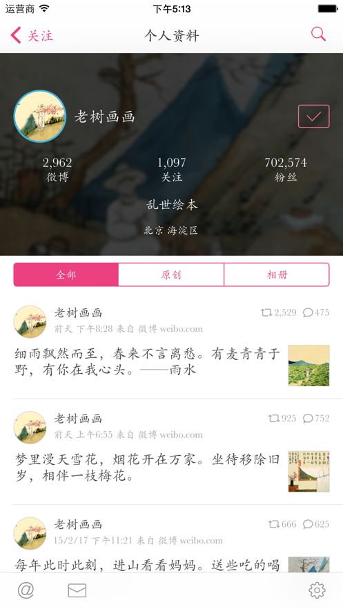 2. 用户相册:原用户微博列表中的图片模式改进为相册。点击用户资料页面的背景图片可以进入相册。