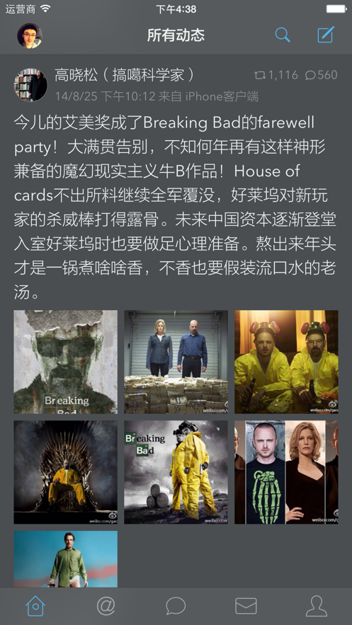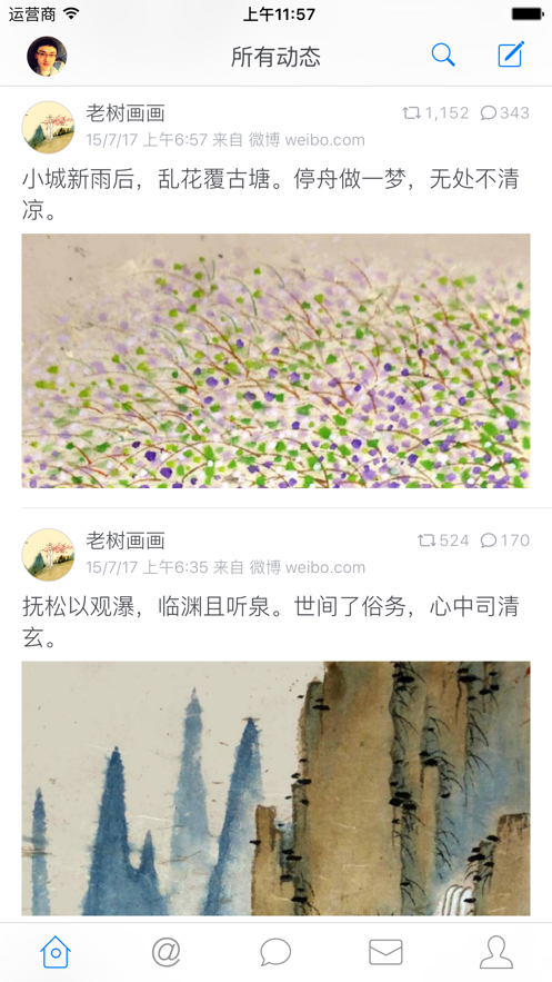 消息通知:有人 @ 你、评论你的微博、给你发私信,都可以收到通知。默认关闭,需要的请在「设置」>「账户设置」中打开。(注意:非实时推送,后台刷新有延时。)