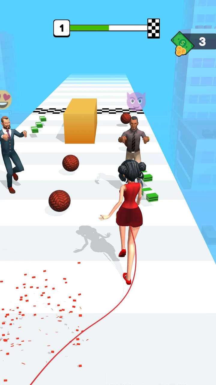 一款闯关游戏,玩家控制角色在关卡的道路上移动,在前方会有很多的障碍需要躲避,收集金钱和线团完成闯关的任务,角色身上的线会不断的拉开所以需要收集线团来到游戏的终点,快点下载游戏吧!