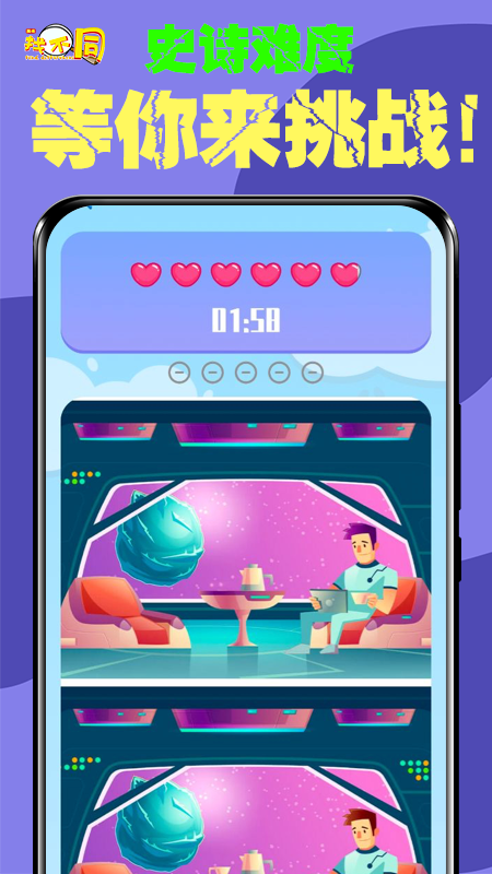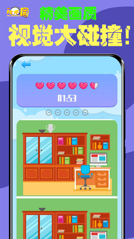 挑战的时间有限需要快速的在图片上观察快速的找到变化的地方,一般图片有好几处的变化,玩家需要将全部的不同点都找到就能完成关卡的任务,超多的关卡可以挑战哦,快点下载游戏吧!