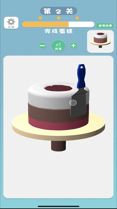 1、游戏随着制作的操作熟练制作的速度会加快,能够制作更加复杂的好看的蛋糕。