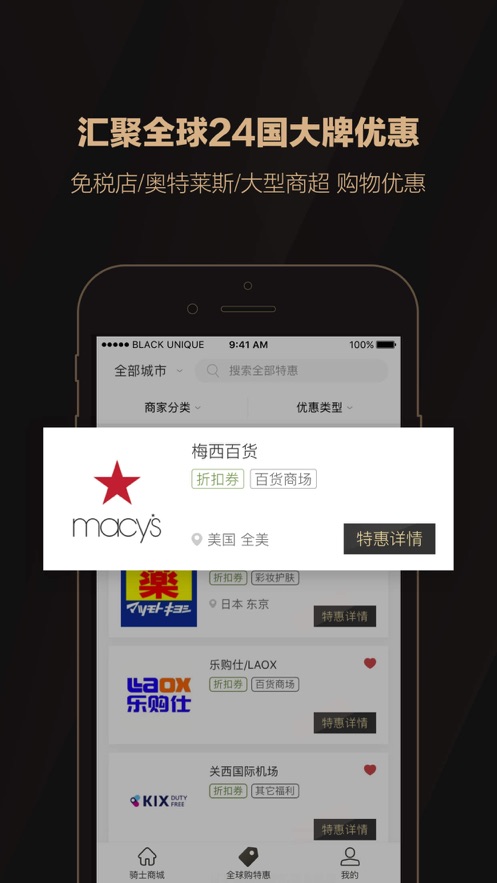 全球购骑士特权目前共覆盖全球24个国家购物优惠,其中包括了奥特莱斯、免税店、名品商超等购物优惠,消费低至4折;