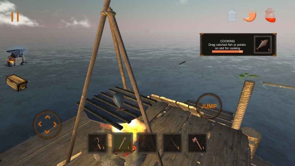 收集更多的物资,扩大自己的木筏面积,在上面建造各种生活用具。