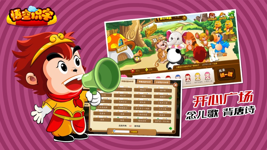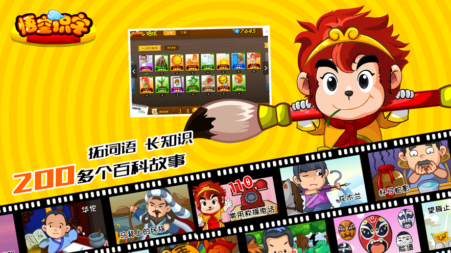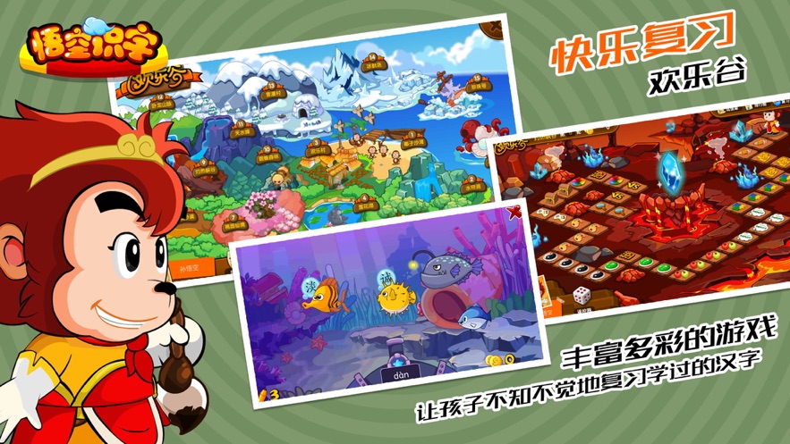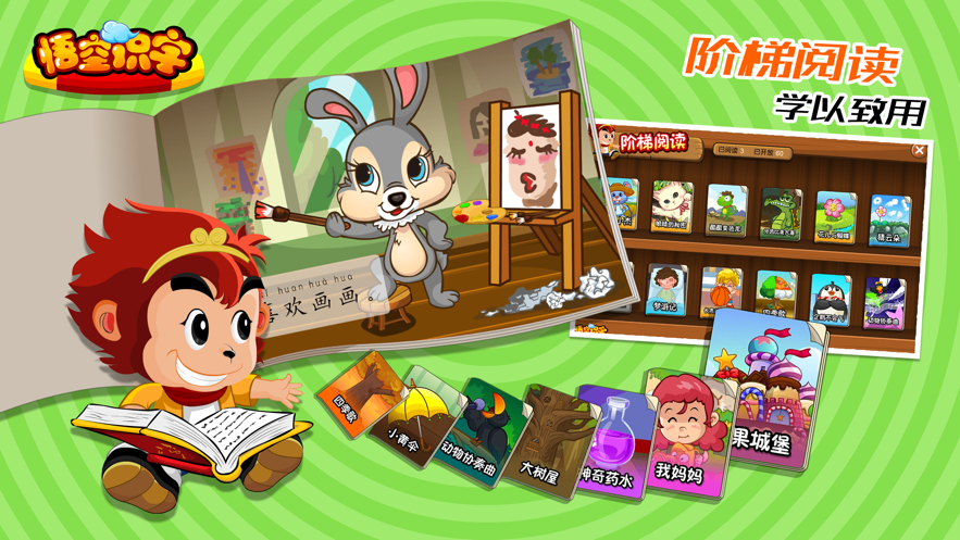 《悟空识字》以西游记为故事背景、15大场景、120多个识字游戏、1200个识字动画;