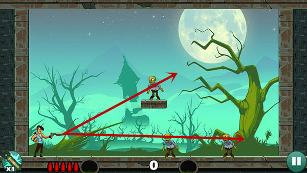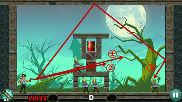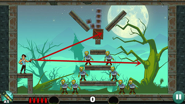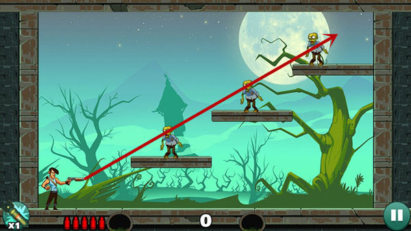 2、和愤怒的小鸟是差不多的,你和僵尸们都是站着不同的,通过瞄准和反弹的方式来消灭僵尸吧。