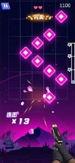 玩家选择自己熟悉的好听的音乐进入挑战,在音乐中会出现很多的小方块,玩家的任务就是射击这些小方块,快点下载游戏吧!